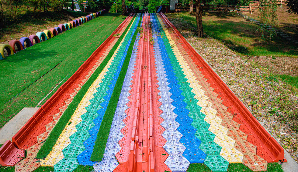 園區內有:彩虹滑梯/滑草道/魚池/沙坑/籃球場,等多項娛樂